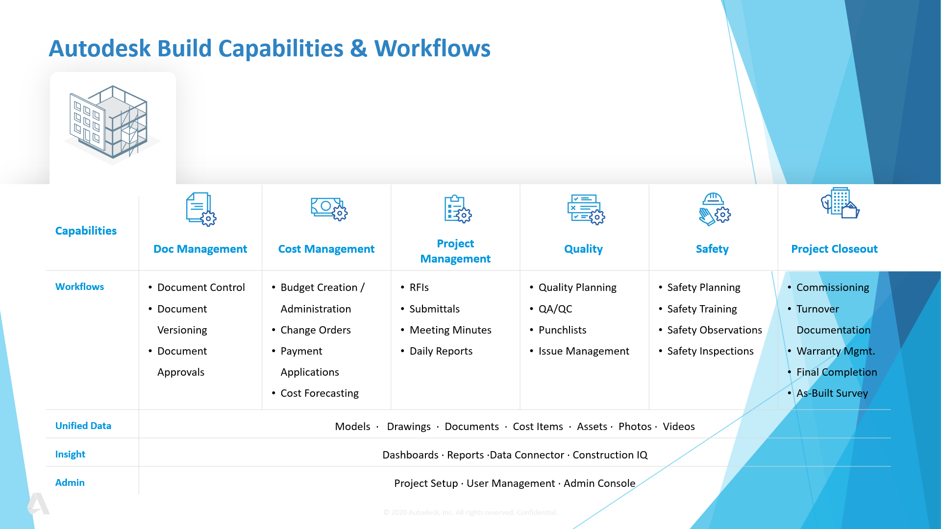 2. Unified Platform - ACC brings Docs, Build, Collaborate, and Takeoff into one connected ecosystem, reducing silos and creating a single source of truth.