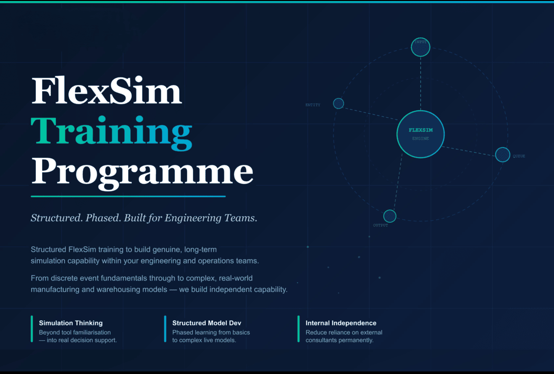 FlexSim training is a structured learning programme that teaches engineers and operations professionals how to build, run, and interpret Discrete Event Simulation (DES) models using Autodesk FlexSim software. Training covers manufacturing lines, warehousing systems, material flow, AGV/AMR automation, and process optimisation — progressing from foundational to advanced modelling skills.