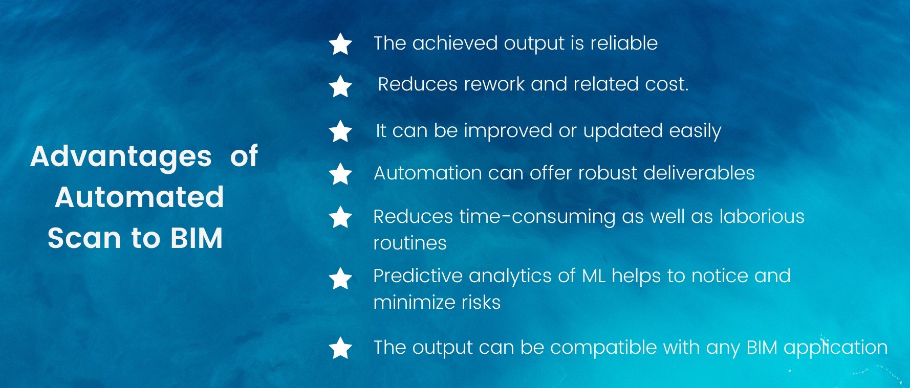 Machine Learning makes Scan to BIM more productive and proficient which minimizes physical efforts and maintains accuracy. Machine Learning spontaneously changes the effects in Scan to BIM. With the help of Machine Learning, Automated Scan to BIM offers a lot of advantages that make it far more credible. These advantages are as follows: