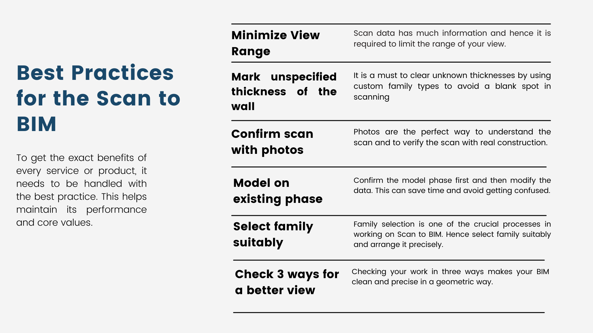 To get the exact benefits of every service or product, it needs to be handled with the best practice. This helps maintain its performance and core values. Here are a few best practices for Scan to BIM: