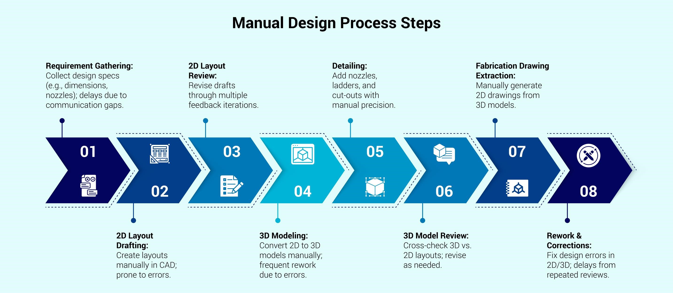 1. Requirement Gathering: Collect design specs (e.g., dimensions, nozzles) with team collaboration; delays due to communication gaps.